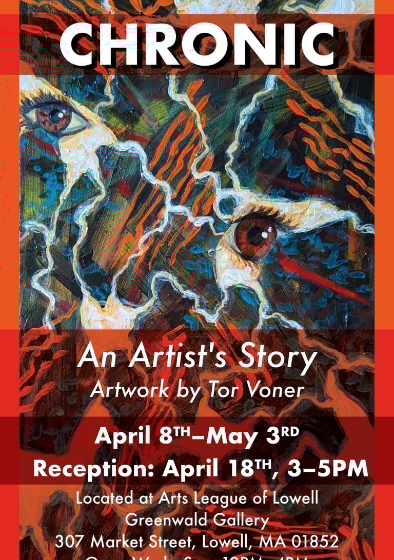 Join us at the downtown gallery in Lowell, MA, and experience what it feels like visually to live with chronic pain. Tor has lived with migraines since she was 5 years old. "CHRONIC: An Artist's Story" will be hanging from April 8th-May 3rd, with a reception on April 18th, from 3–5 PM.