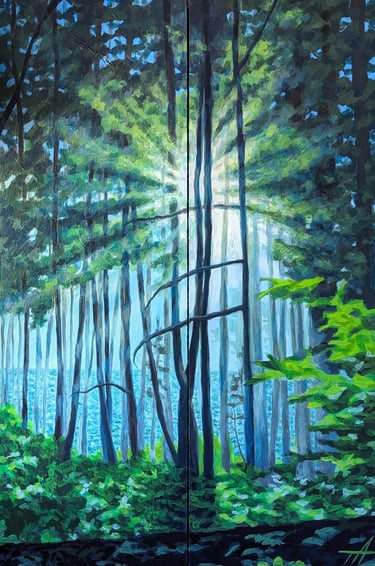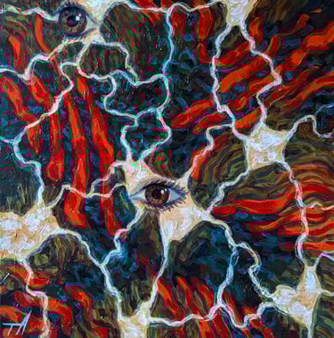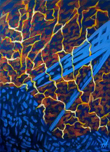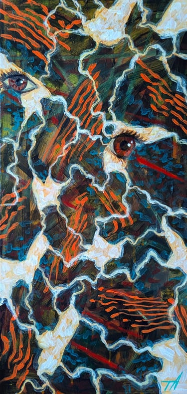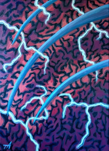 The first painting created with this theme, last summer, in 2025, I just got through a horrific 2-week migraine episode, that I hadn't dealt with in a long time, a flare-up. So getting it all out on canvas, channeled the frustration I was feeling. Something inside clicked, and I realized I loved the feeling of these types of artworks. What they make me feel, whether uncomfortable or not, being surrounded with this type of visual environment, pulls a person into a different world. It also feels amazing expressing myself, in this way. ¶ So on I went after a few fall hiking vacations, into my tiny studio at home to express my chronic migraine pain all I could, being a part of my life, since I was 5 years old. All of winter and into early spring, I have been seeing where this journey would take my paintbrush, trying to plan nothing along the way. I realized my migraines were really broken down into phases of pain, and the visual pain they evoked from my imagination are visually very different. The fun but challenging part of this show was that I tried to find some language that would tie them all together, so the audience knew they were from the same family of artworks. ¶ When the migraine strikes, the eye series is what came to mind, or my minds eye. Lightning pulses start behind the eyes, throbbing, there is no way out. The brain starts to feel like it's exploding from the inside, with much unpleasantness. ¶ The tornado series shows what it's like in the thick of it, like a real storm, it's hard to feel like it will ever be over, the extreme environment blinding all reality. It feels like being swept up inside a twister, nothing makes sense, everything feels challenging, just wanting to drop everything, and hang on. ¶ The next stage I call "the migraine hangover," with a full blown fog effect. The haze over every decision, every move your body makes feels hard, like you are moving through quicksand. ¶ Finally, the moment the fog lifts, and everything feels amazing. Where joy becomes so much easier to find, after going through that pain. The closing and/or opening painting of the show I made a few years back, but I also wanted a cleansing piece for the viewer, to bookend the fact that the sun WILL come out and blast away the pain. Every day is different, and tomorrow is another day.